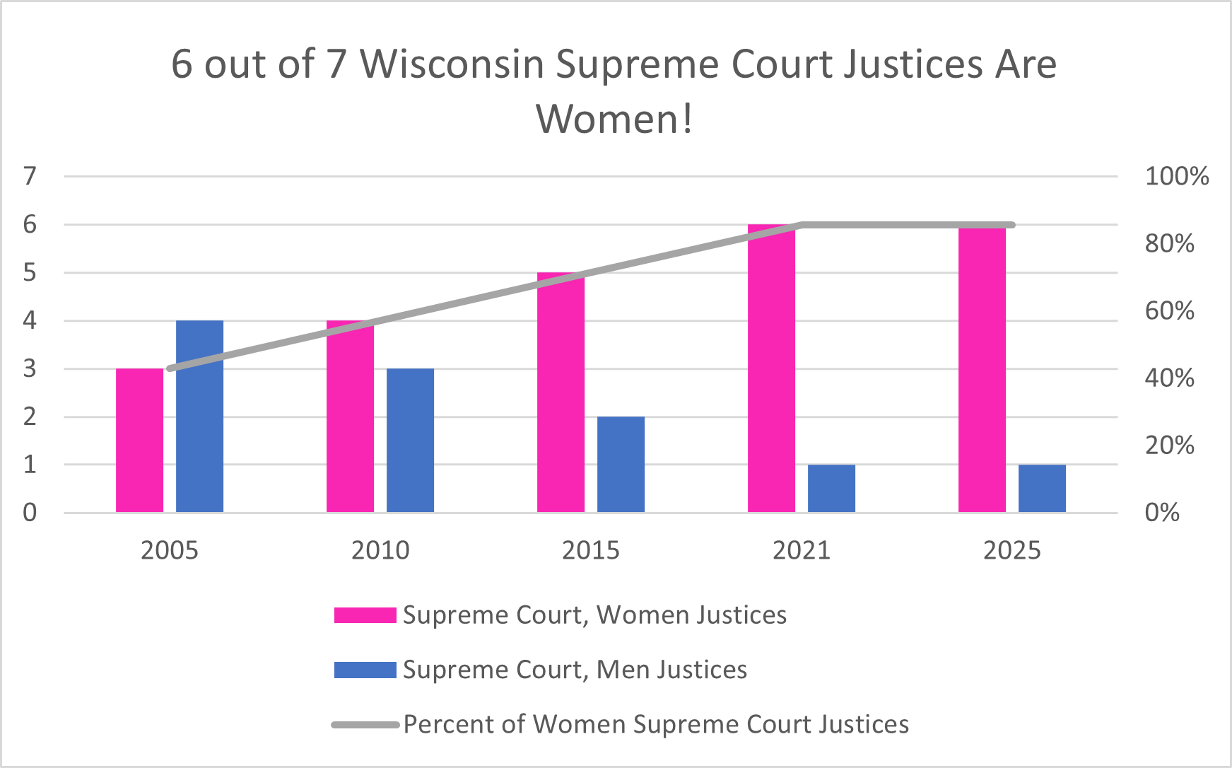 This chart shows the number of women and men serving as judges on the Wisconsin Court of Appeals over time. Women’s representation increased steadily across the two decades, rising from three judges in 2005 to ten in 2025, reflecting a gradual but significant shift toward greater gender balance on the appellate bench. By 2025, women exceeded parity on the Court of Appeals, holding 10 of 16 seats (63%), marking a notable milestone in the diversification of Wisconsin’s judiciary!